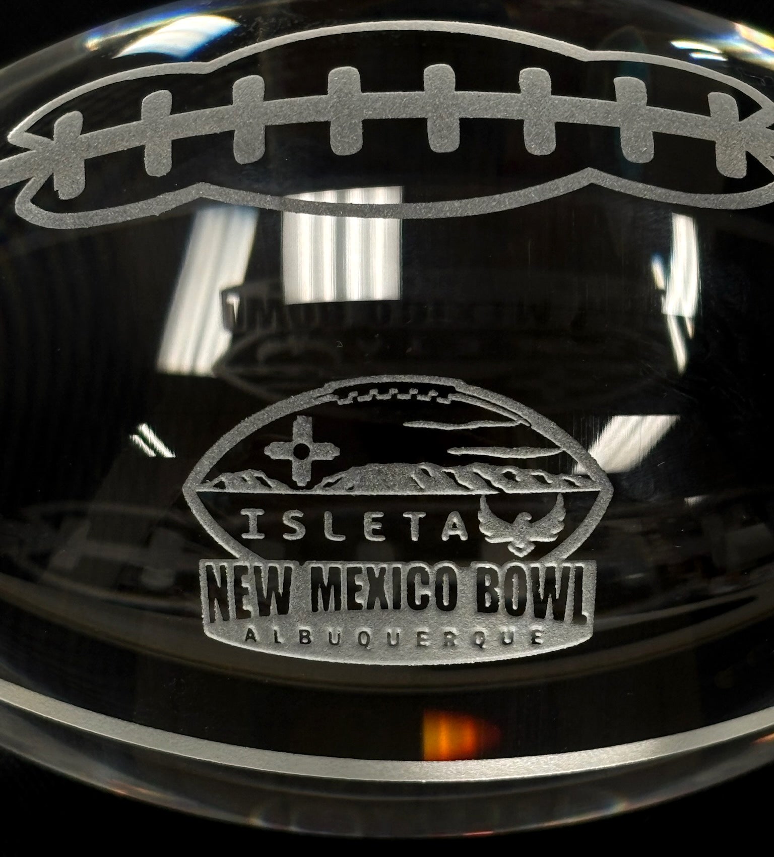 As a true collector's item, this limited edition New Mexico Bowl crystal football is made of real crystal. With its unique design and expert craftsmanship, this football is a must-have for any football fan. Showcase your love for the game with this stunning and rare piece.